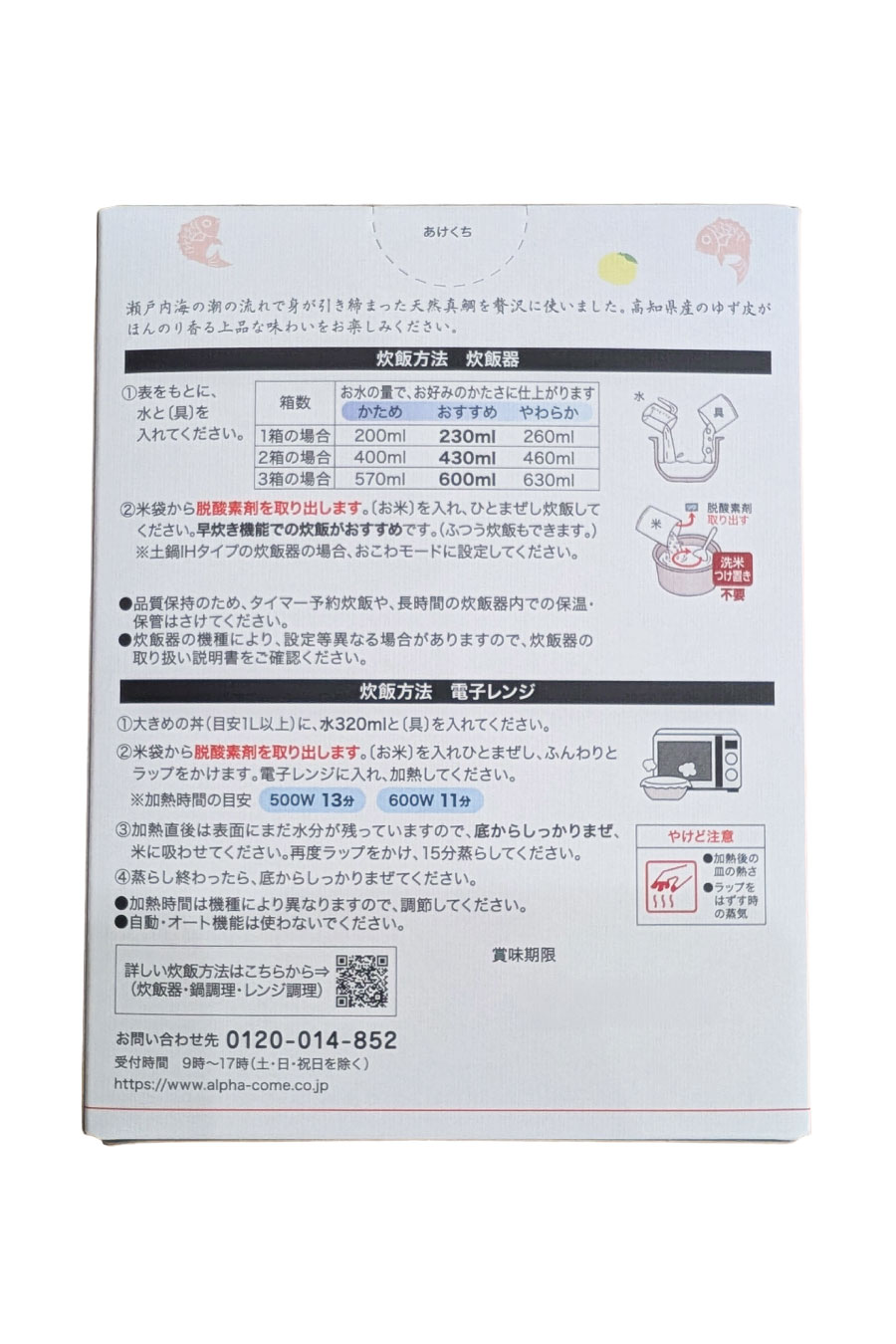 鯛おこわのもと:まだい、植物油、食塩、たいエキス、ゆず果皮粉末/調味料(アミノ酸等)